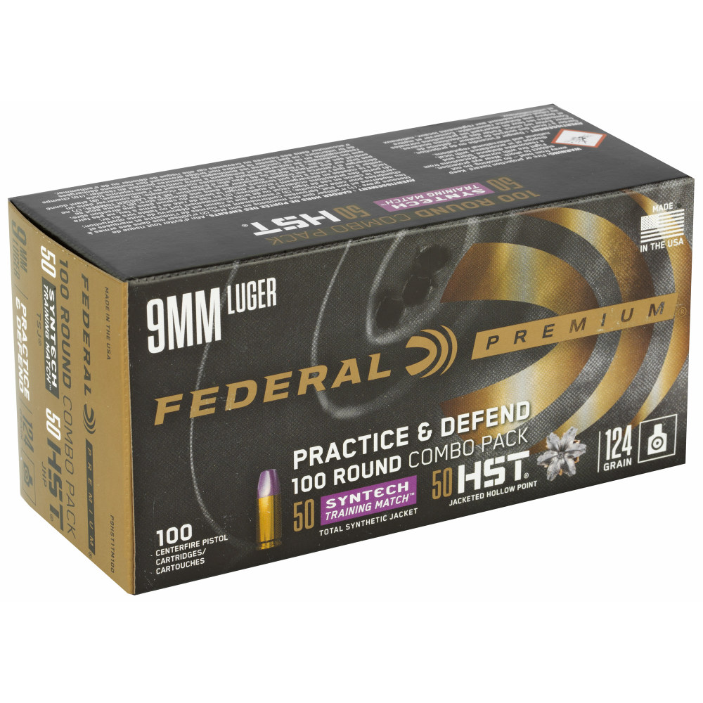 Federal Premium, Practice & Defend, HST, Syntech, 9MM, 124Gr, JHP/TSJ, 100 Round Box P9HST1TM100