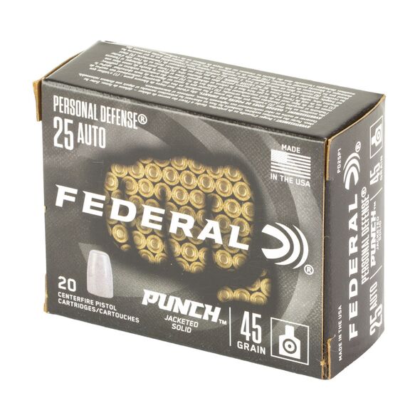 Federal Personal Defense Punch, 25 Auto, 45 Grain, Jacketed Solid Point, 20 Round Box PD25P1