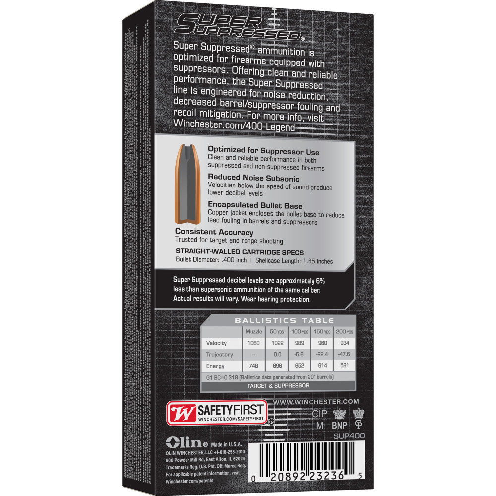 Winchester Ammunition Super Suppressed, 400 Legend, 300 Grain, Subsonic, Open Tip, 20 Round Box SUP400