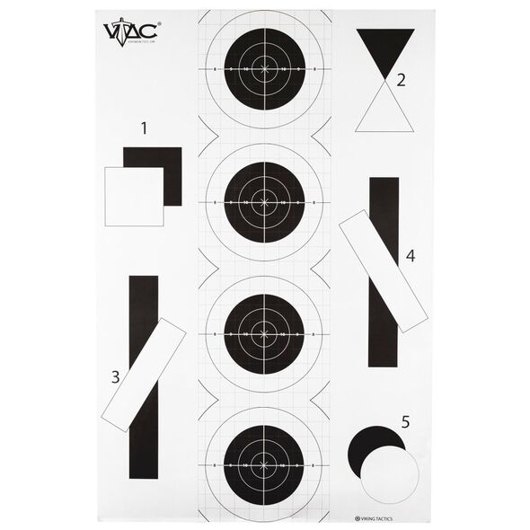 Action Target VTAC-P, Viking Tactics Double Sided Advanced Training Target, Marksmanship Side Has 4 SR-1C Bulls-Eye Target w/1" Square Sighting Grid, Silhouette Side w/Visible Skeleton, Black/White, 23"x35", 100 Per Box VTAC-P-100