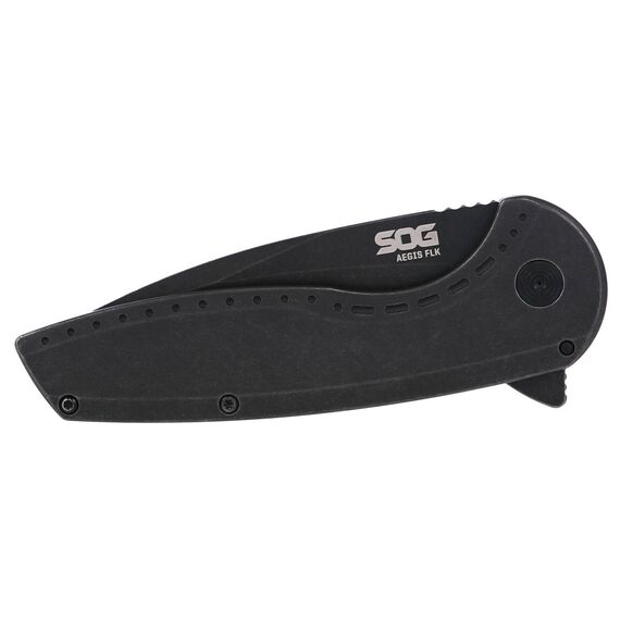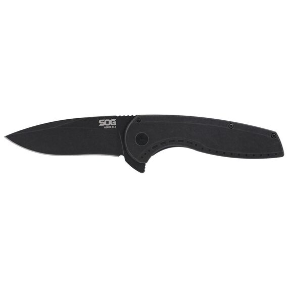 SOG Knives & Tools Aegis FLK 2.0, Folding Knife, 3.25" Drop Point Knife, 8" Overall Length, 8Cr13MoV Stainless Blade Steel, Straight Edge, Stonewash Finish, Black, Black 410 Stainless Steel Handle, Kick Opener, Frame Lock SOG-14-41-05-43