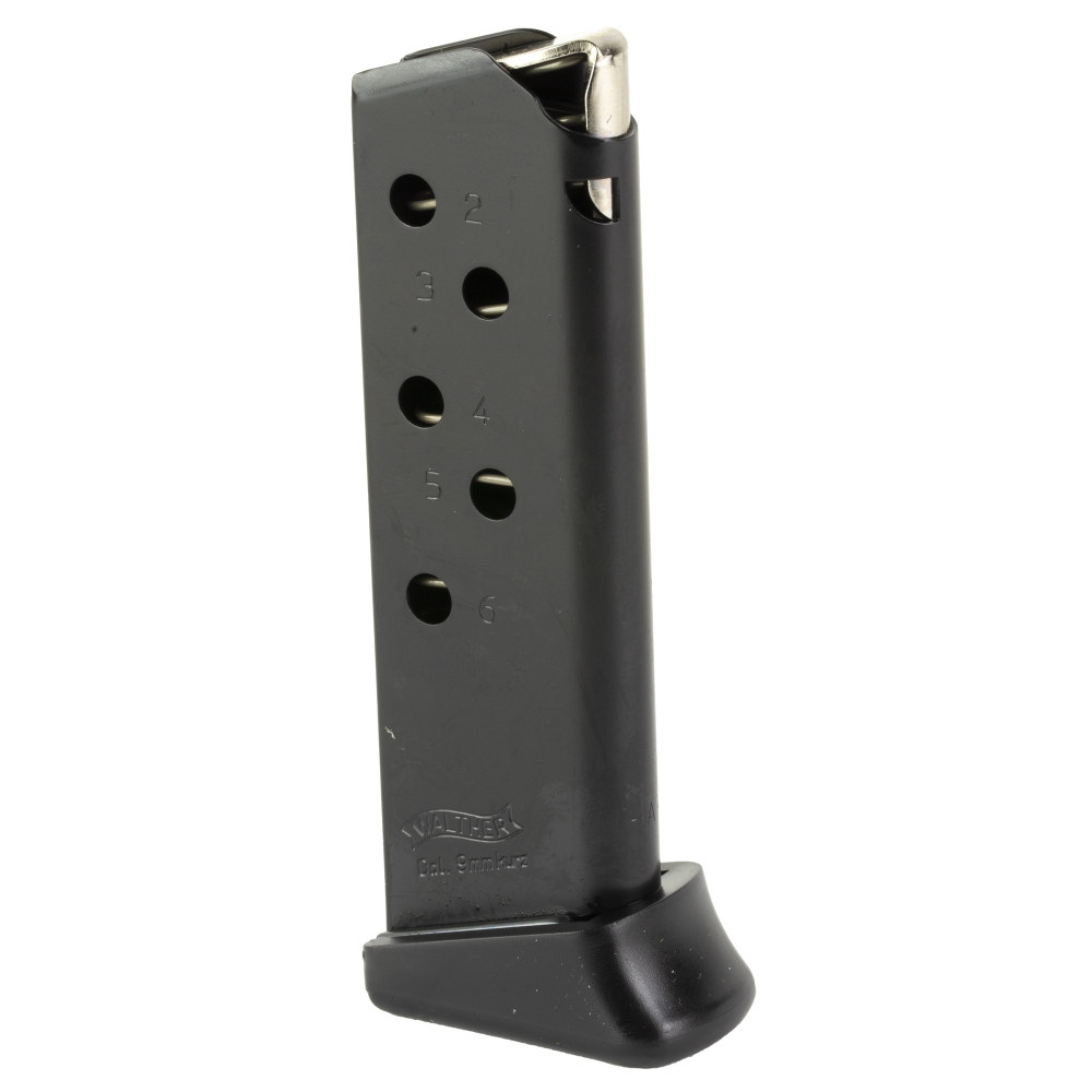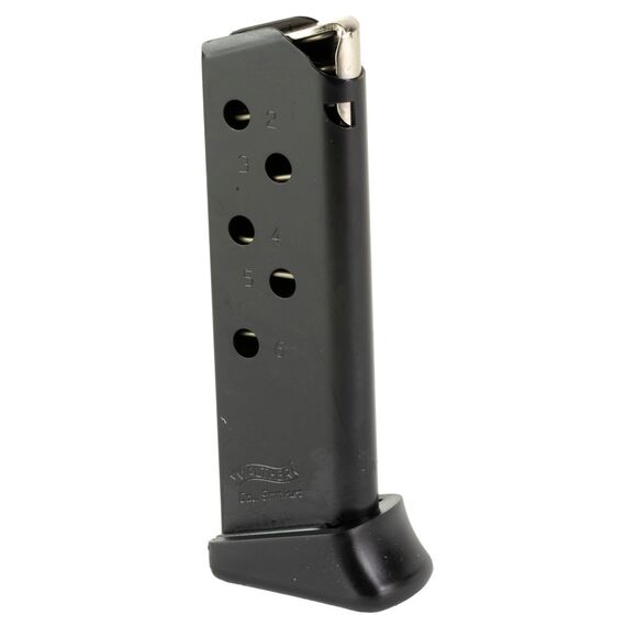 Walther Magazine, 380ACP, 6 Rounds, Fits Walther PPK, with Finger Rest, Anti Friction Coating, Black 2246026